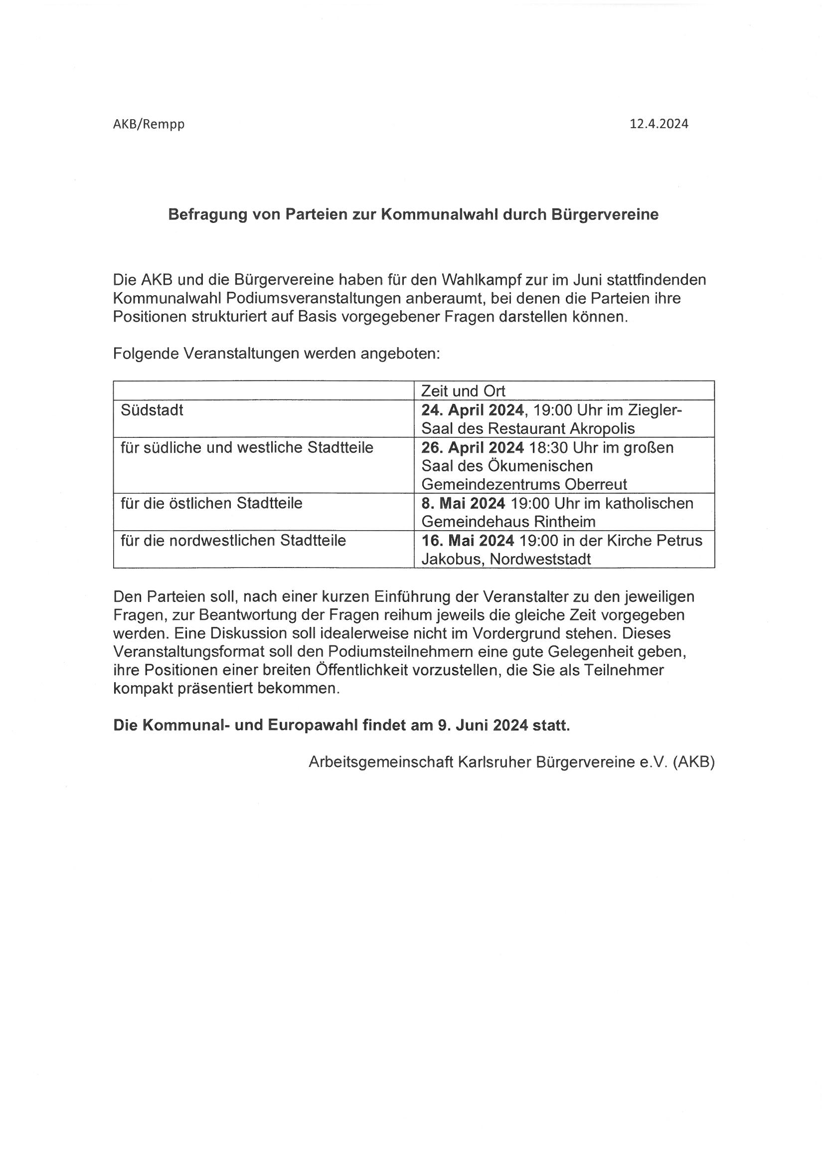Die Arbeitsgemeinschaft Karlsruher Bürgervereine lädt zu Podiumsgesprächen zur Kommunalwahl ein.
