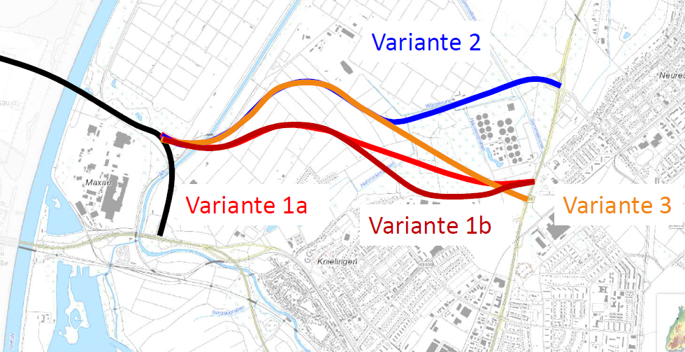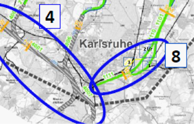 Das Bahnprojekt Mannheim – Karlsruhe ist in den Planungen weiter gediehen. Die Planungen wurden weiter verfeinert und durchgehende Linienvarianten vorgestellt. Tatsache ist nach wie vor, dass 2 Gleise für den zukünftigen Güterverkehr durch das Stadtgebiet Karlsruhe gelegt werden müssen, entweder im Westen (Nr. 4) oder im Osten (Nr. 8).