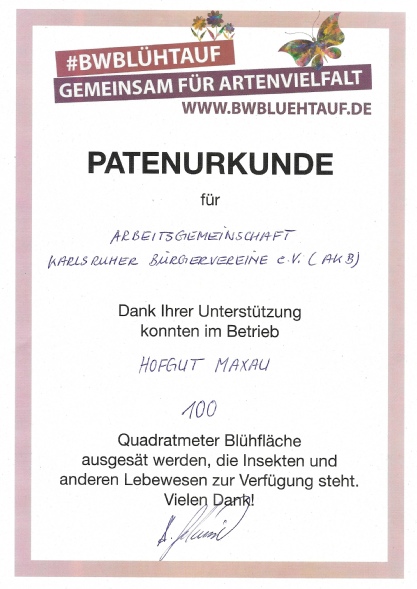 Von den drei anbietenden Bauernhöfen im Raum Karlsruhe haben wir das Hofgut Maxau ausgewählt. Seit Sommer hat die AKB eine Blühstreifenpatenschaft mit dem Hofgut Maxau zunächst für 2 Jahre abgeschlossen.