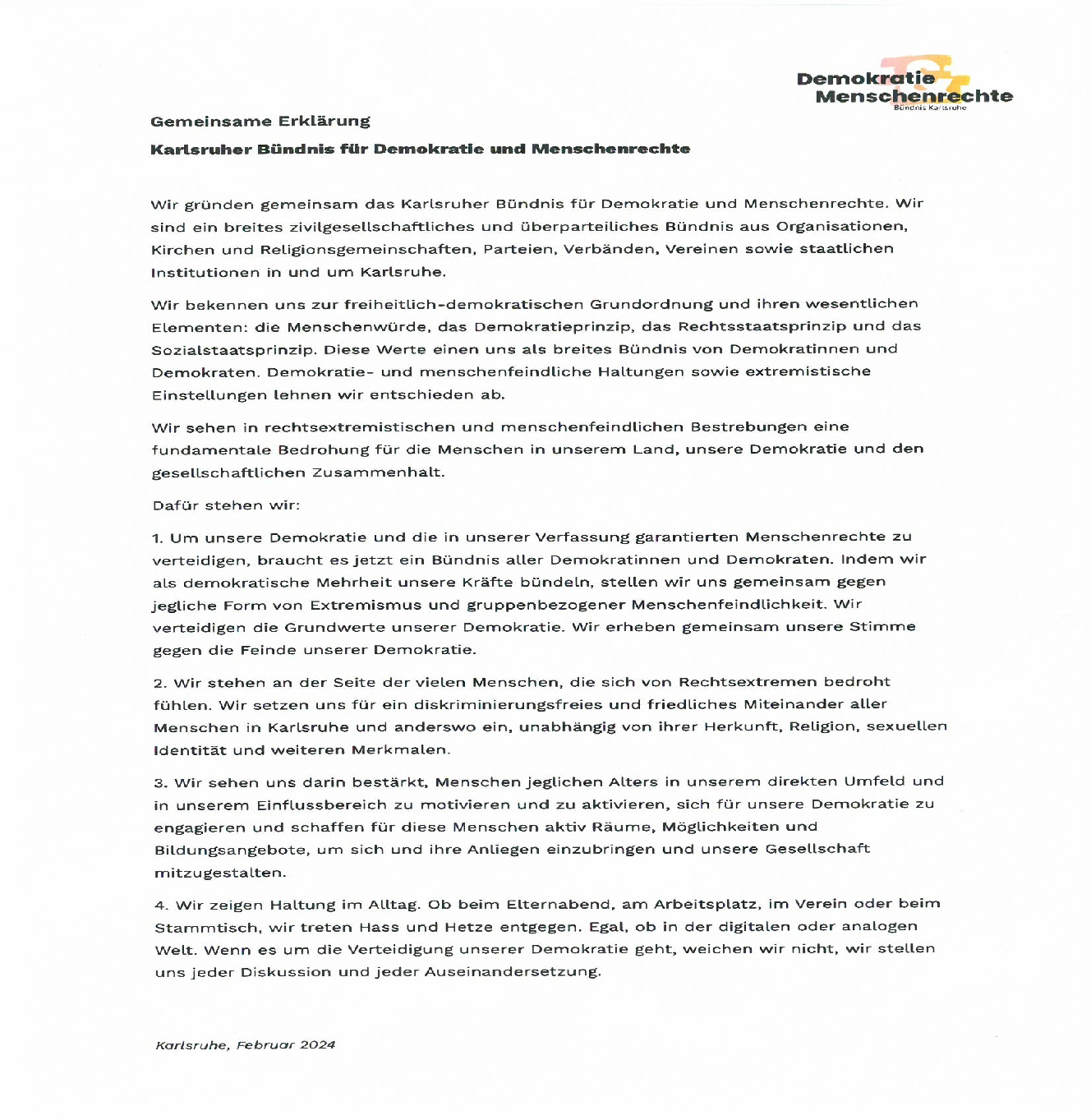 Im Februar ist die AKB nach einstimmigem Beschluss dem Karlsruher Bündnis für Demokratie und Menschenrechte beigetreten, das von über 40 Organistionen (Anhang) unterstützt wird.