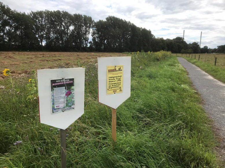 Es handelt sich um eine 100 m2 große Blühfläche von der Streuobstwiese am Hofgut Maxau Richtung Knielinger See. Wenn Sie beim Hofgut Maxau spazieren gehen, können Sie den Blühstreifen südlich vom Hofgut leicht finden. Dort steht auch ein entsprechendes Schild.